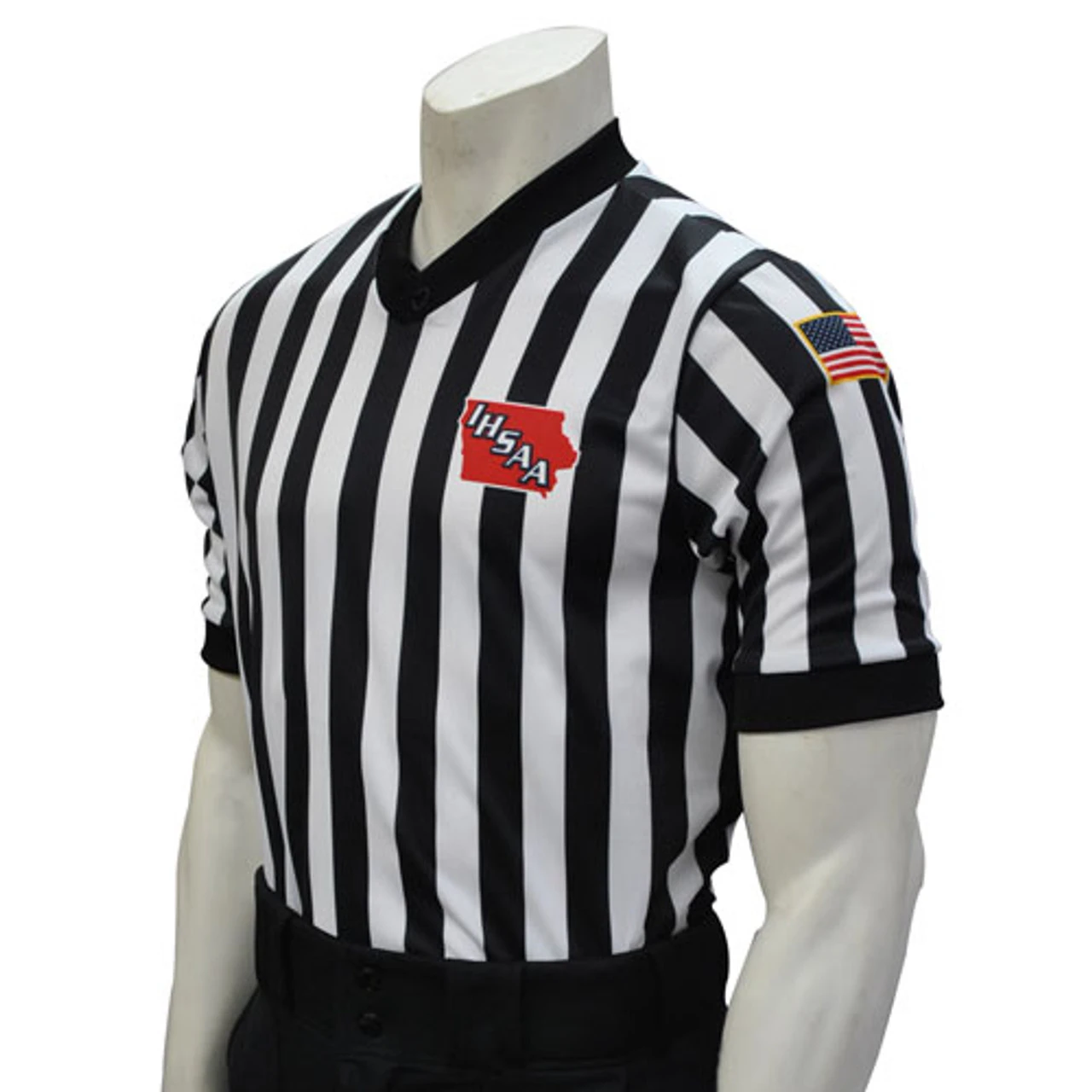 Dye Sublimated with the Iowa IHSAA logo on the chest and a gold border US Flag on the sleeve. Premium performance fabric shirt is so lightweight and the cut is so comfortable that you may not even realize you’re wearing your stripes. A great choice in the heat because of it’s high wicking and fast drying properties. ”Tight V” neck opening with loop to attach your lanyard. Smitty USA has become the leader in manufacturing of dye sublimated shirts for sports officials nationwide. All Smitty Apparel products are designed by one of the top officials in the world, for officials. Made In The USA.