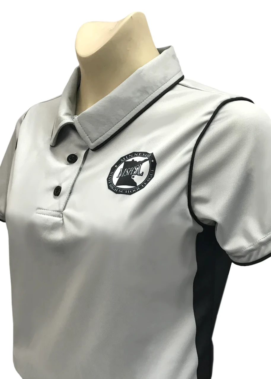 Grey performance polyester performance mesh shirt for Minnesota officials. Minnesota State High School League logo dye sublimated on the left chest. Lightweight and comfortable. A great choice because of it’s high wicking and fast drying properties. ”Tight V” neck opening with loop to attach your lanyard.