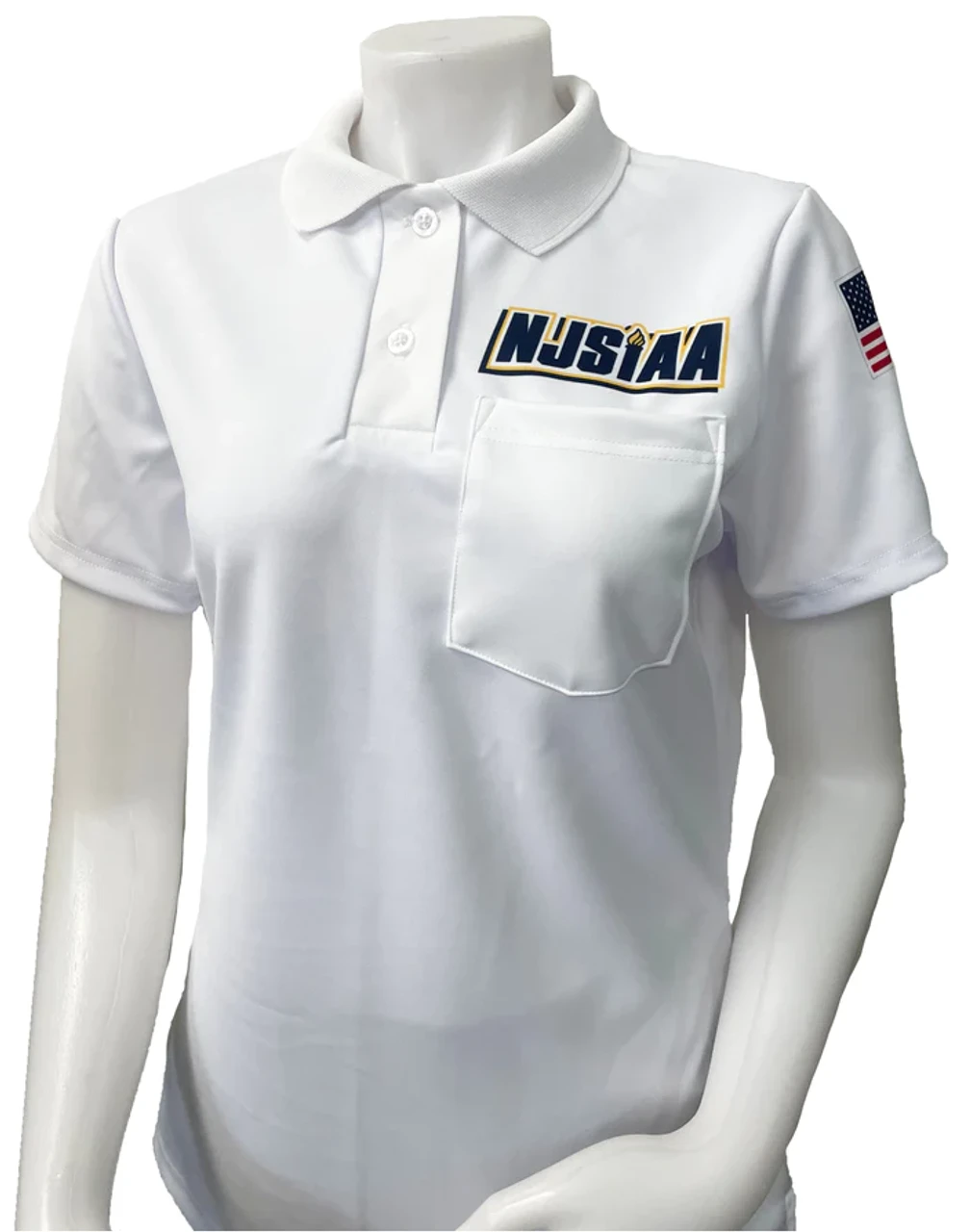 Smitty “Made in USA” New Jersey NJSIAA Women’s Volleyball/Swimming Short Sleeve Referee Shirt with Pocket! This high-quality shirt is designed specifically for female referee’s for volleyball and swimming. A women’s cut to ensure a comfortable and flattering fit. The solid white color gives it a clean and professional look. Convenient pocket located on the left chest. Constructed from 100% performance polyester fabric, this shirt guarantees superior breathability and moisture-wicking properties, allowing you to stay cool and dry even during intense matches. The fabric is fully dye-sublimated with the New Jersey NJSIAA logo on the left chest, ensuring vibrant and long-lasting colors that won’t fade over time. Features a white border USA flag on the left sleeve. Rib knit collar and self-hem sleeves that provide a secure fit while allowing freedom of movement. Each shirt is proudly made in the USA, guaranteeing the highest quality and craftsmanship.